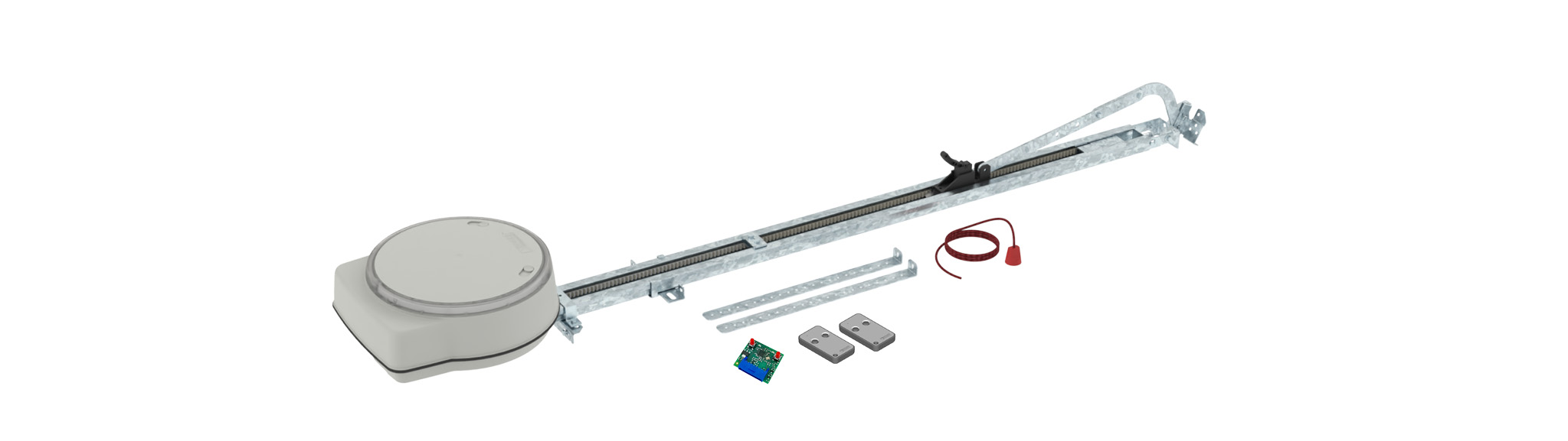 Kit avec moteur brushless 1400N avec unité de commande et récepteur intégré, matériel de fixation, 2 émetteurs et rail en acier avec accouplement moteur intégré, longueur 4 m avec courroie déjà installée à bord.