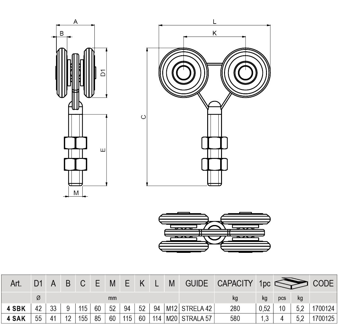 Bloc de roulettes quadruple avec roulement étanche pour portes coulissantes et volets - roue de 42 mm de diamètre