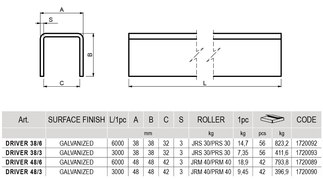 Rail profilé en « U » pour portail coulissant, profilé supérieur, l. 38 mm x h. 38 mm x l. 6 m