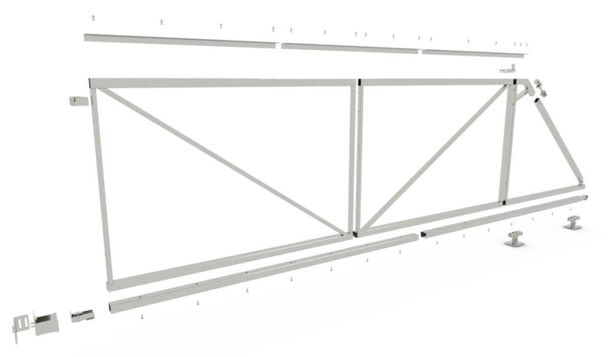Set gecertificeerd stalen poortframe vrijdragende schuifpoort 4m openingsbreedte, totale poortlengte 5m85 (pakketlengte slechts 2m85). Set bevat frame, alle beslag en bouten om gewenste vulling aan te bevestigen, hoogte 1m80.