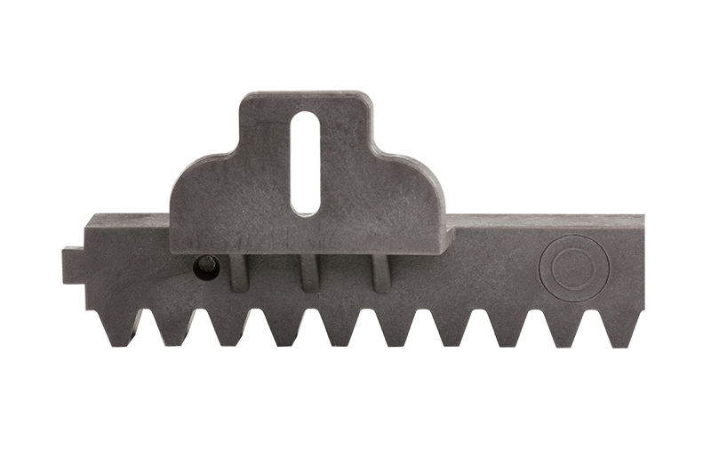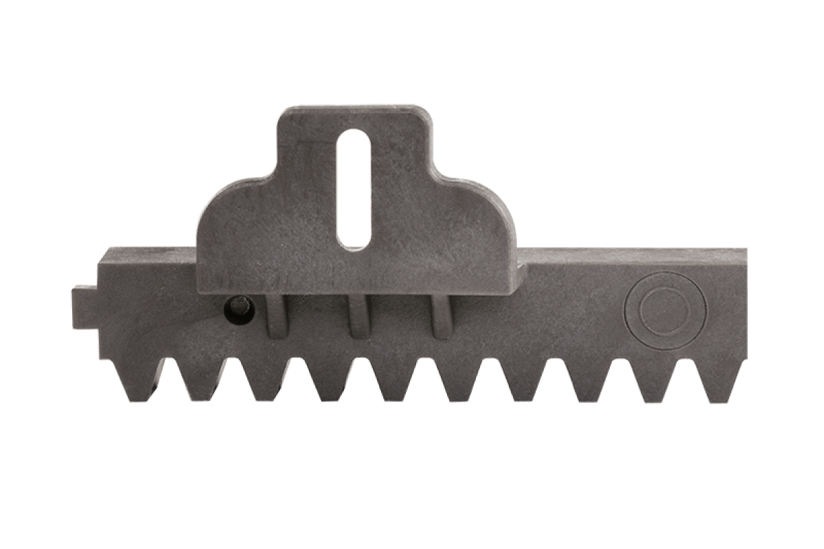Een grijze pvc tandlat met stalen kern, met omgekeerde bevestigingspunten zodat ze naar boven wijzen. Lengte 1 m - Bevestiging naar boven. Gemaakt van 30% glasvezel polyamide voor poorten met een maximaal gewicht van 1200 kg.