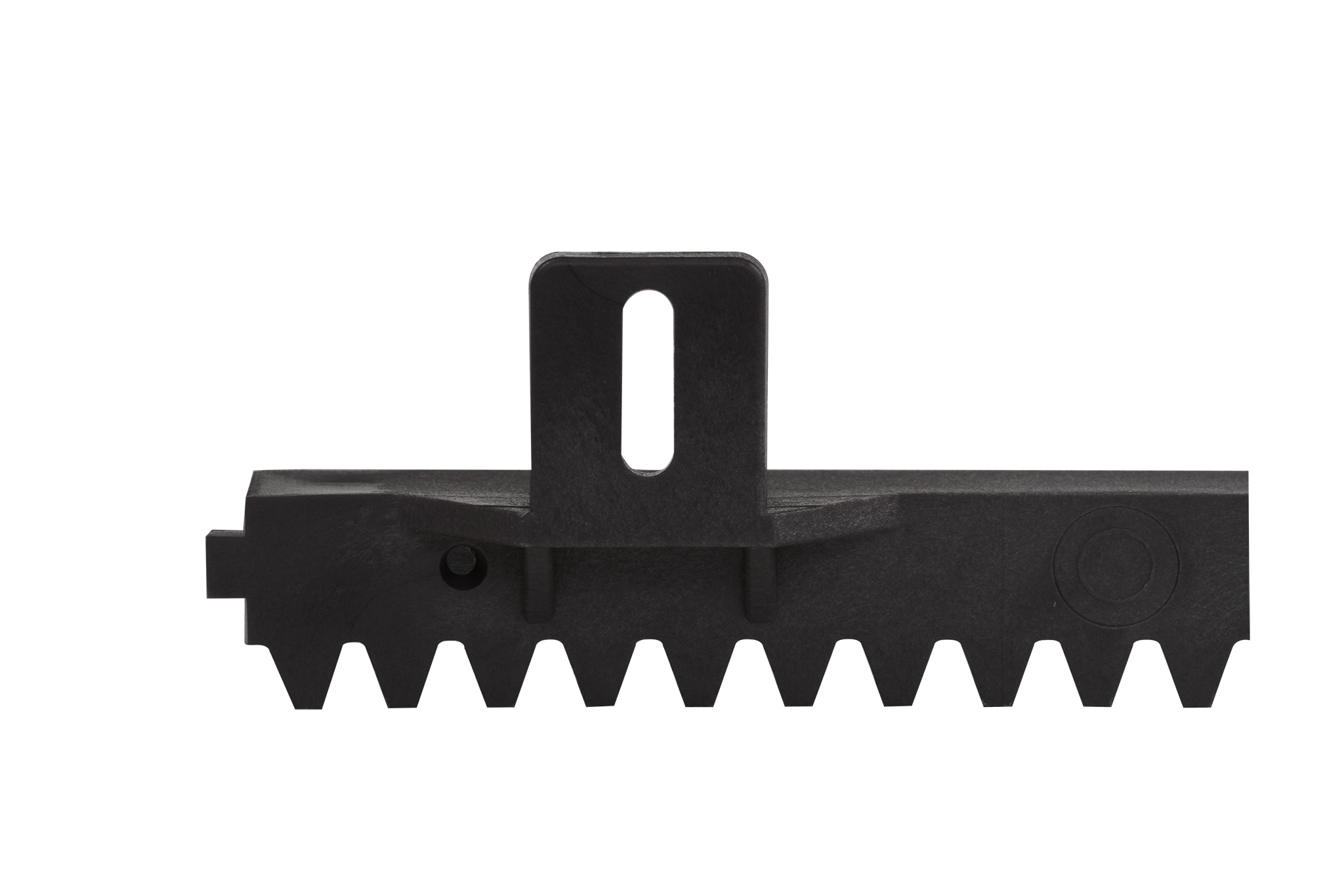 Een zwarte pvc tandlat met stalen kern, met omgekeerde bevestigingspunten zodat ze naar boven wijzen. Lengte 1 m - Bevestiging naar boven. Gemaakt van 30% glasvezel polyamide voor poorten met een maximaal gewicht van 800 kg.